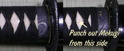 The small end of the mekugi may also be hidden under the tsuka-ito (handle