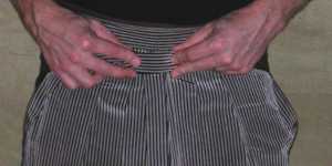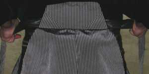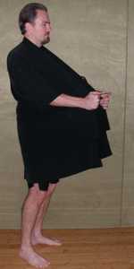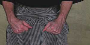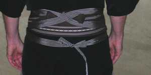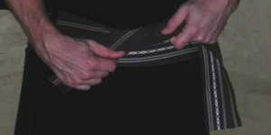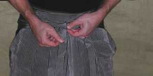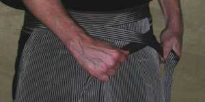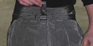 - The koshi-ita (rigid board section) of the hakama is worn above the knot